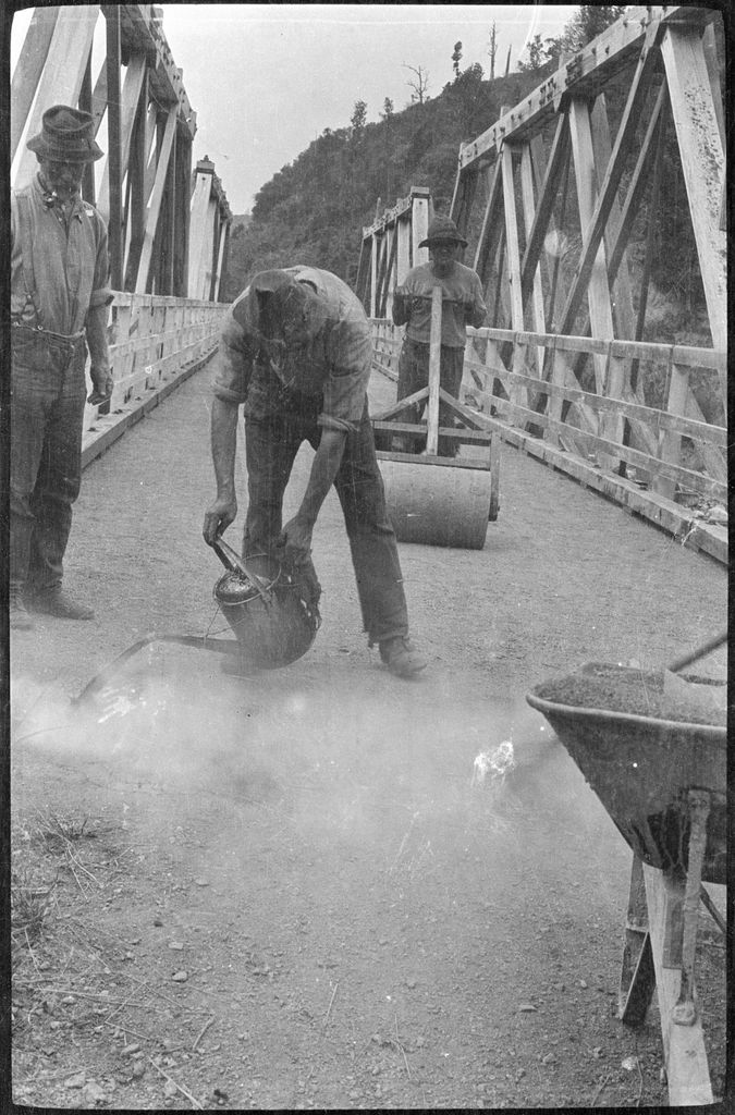 Workers are repairing the tar seal on an unidentified bridge, thought to be an early bridge in the Manawatu Gorge.