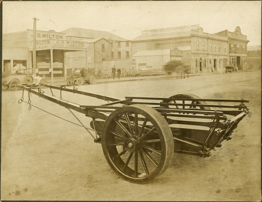 Shown here is a hillside car built by Adam Burges at his coach building and agricultural implement factory located on the corner of Rangitikei and Queen Streets in Palmerston North The cart was built for use on farm hills hence the crank axle and low-slung body to prevent the cart from tipping over.