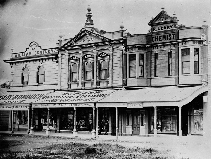 These three premises were situated on the southern side of The Square, between Church Street and Main Street west. William Park bought his business in Palmerston North in 1882, and later this building of 8000 square feet was designed by Ernest Larcomb, for him.. Richard Leary, a chemist and optician, established his business in 1875. This building, also designed by E Larcomb, was purpose built for Leary, made of wood and iron and had a floor space of 5200 square feet.