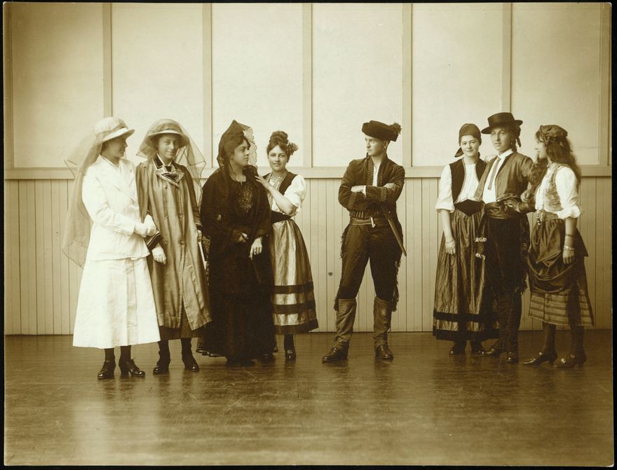 Pictured here is the cast of the original comedy, "The Cup", performed by the students of Craven School for Girls for the benefit of the Sick and Wounded Soldiers Fund. From left: Molly Russell, Glory Simson (?), Helen Hewett, Dorothy Levin, Unknown, Nita McHardy, Betty Abraham. The Craven School for Girls was a boarding and day school for young ladies, mostly from Palmerston North but some of whom came from as far as the South Island to board at the elite school.