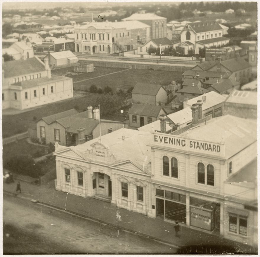 The Evening Standard in Main Street East, near the corner of The Square. The third Public Library was situated in the wooden building to the left of the Evening Standard office. This particular building was constructed in 1897, and originally served as the Borough Council Offices, but by 1905 it became too small for this purpose. The Public Library occupied the site until 1929.