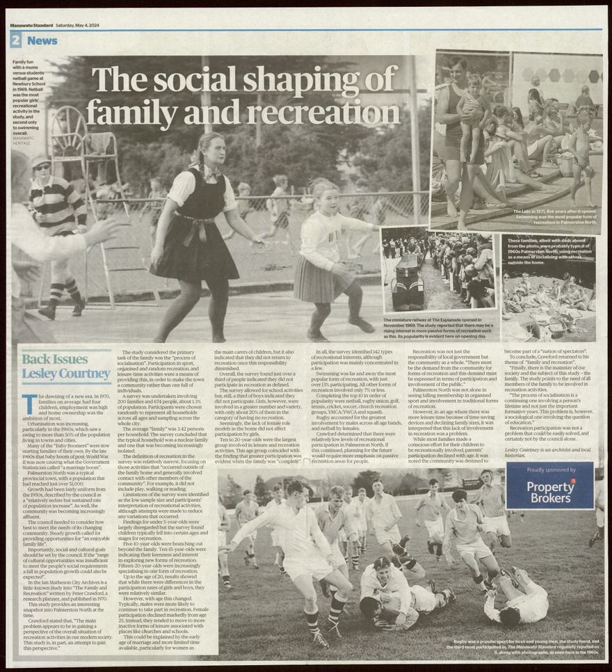 Local historians weekly "Back Issues" article in the Manawatū Standard. A 1970s study "The family and recreation" by Peter Crawford describes family recreational activities in Palmerston North at that time.