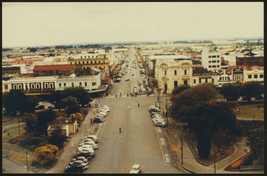 This photograph was taken from the top of the Hopwood Clock Tower when it was being constructed in 1956. It looks down Rangitikei Street. The large concrete building on the corner of Rangitikei Street and The Square is the Bank of New Zealand. Palmerston North's first BNZ was situated on the corner of Fitzherbert Avenue and The Square. In 1914-15 this building was built on the site of the old Royal Hotel, on the opposite side of The Square. In 1988 it was demolished and a new Bank of New Zealand was again constructed on this site. The site is now occupied by retail outlets. On the other side of the intersection stands the brick building which served as the Clarendon Hotel from 1904-1927 and thereafter as a block of shops - primarily Goldfinch and Cousin's menswear business. In 1931, after the Napier earthquake, the top storey was hurriedly demolished as a potential risk (as were the Post Office and Grand Hotel towers). This building no longer exists and the site is occupied by the Commercial Union and Westside Buildings that contains @ The Hub (a student hostel) and the Rangitikei Convenience Store.
