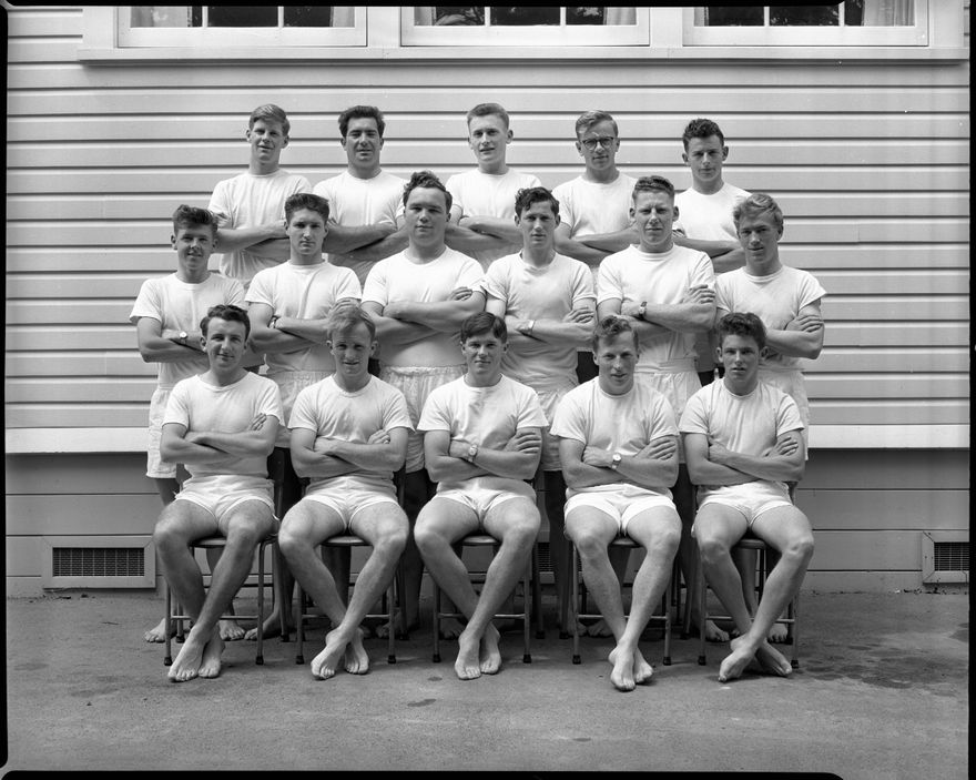 A group of sixteen male students from the Palmerston North Teachers' College pose in their sports uniforms. This negative comes from the Elmar Collection - a large series of semi-identified and unidentified images from the 1930s-1970s.