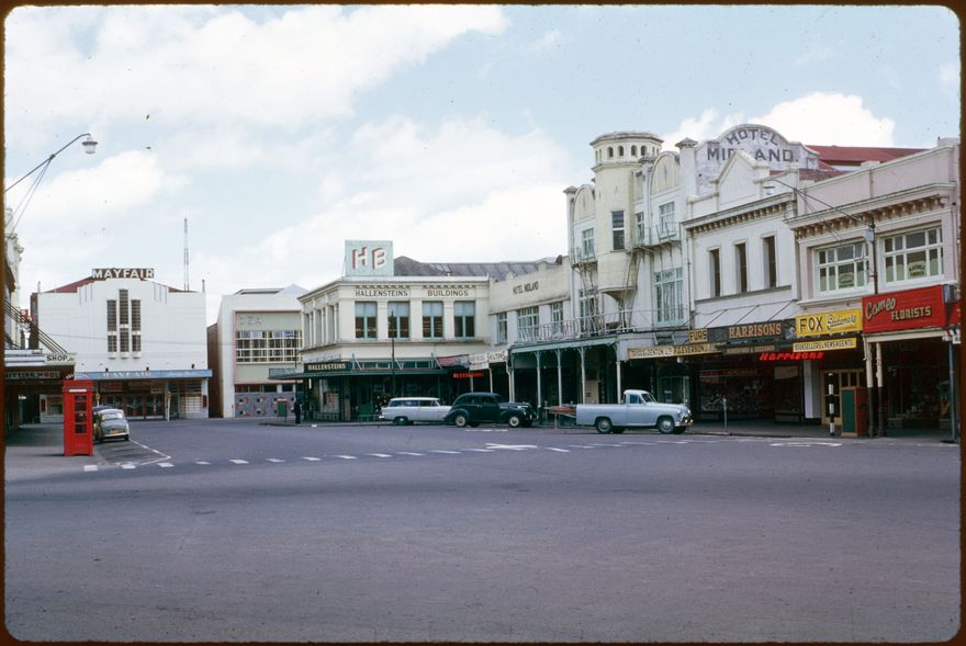 Looking down Coleman Place to George Street, showing businesses: Mayfair movie theatre); 2ZA (radio station); Hallensteins (now Youth Space); Midland Hotel; Harrisons (nurserymen); Fox Stationels (booksellers and newsagents); Cameo Florists