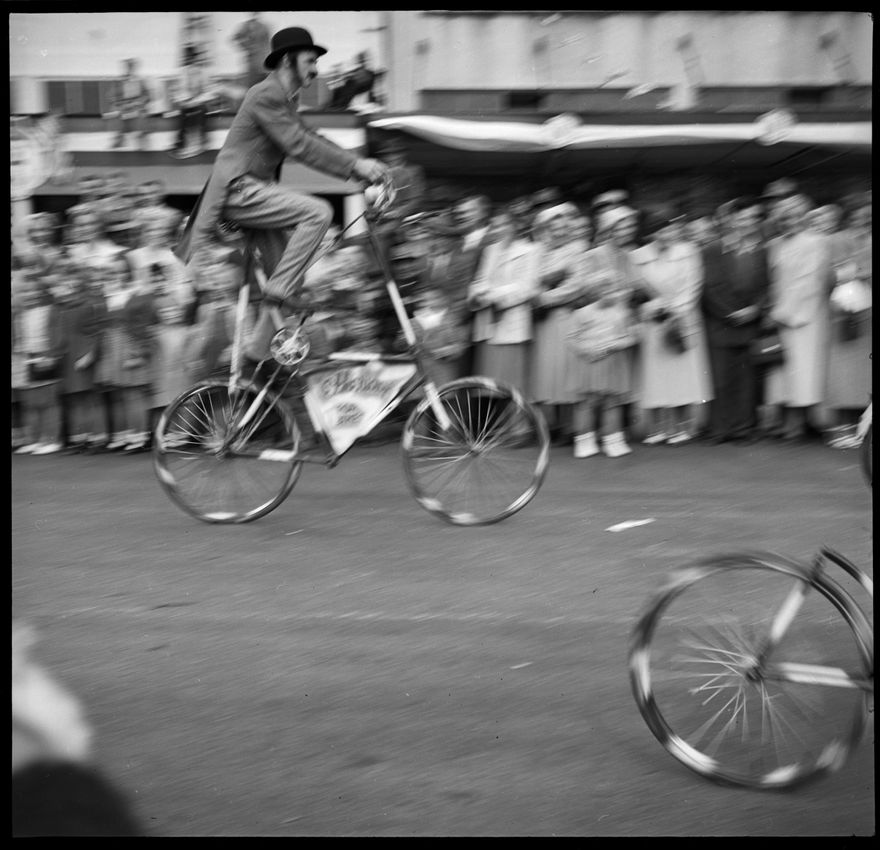 Cyclist on vintage bicycle in "Cavalcade of Transport Through the Ages," 75th Jubilee Celebrations