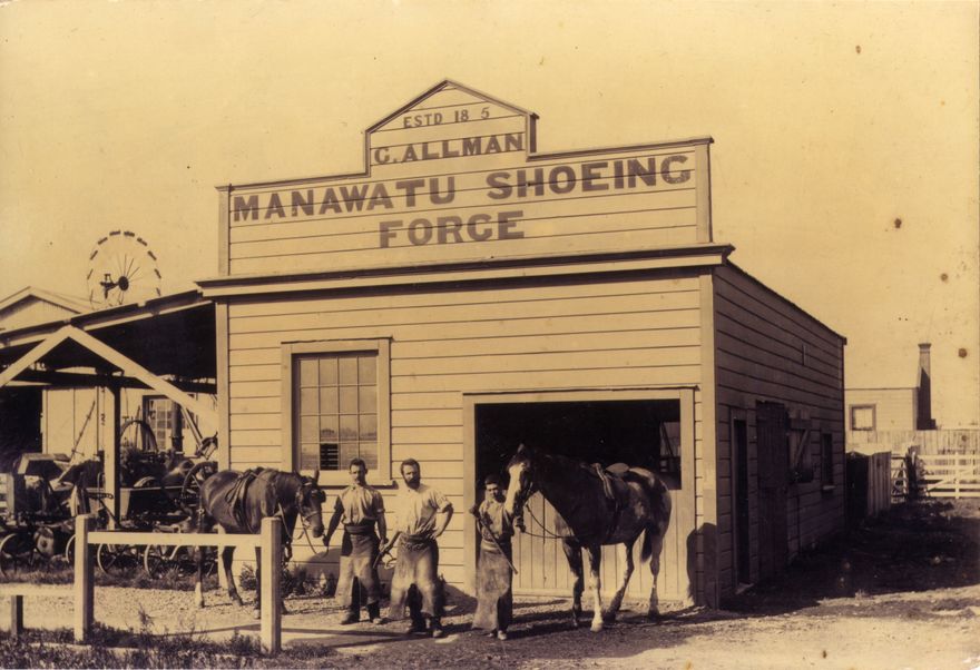 Photograph of G Allman Shoeing Forge which was established circa 1885 and was located at the intersection of Highway 57 and Karere Road, Longburn.