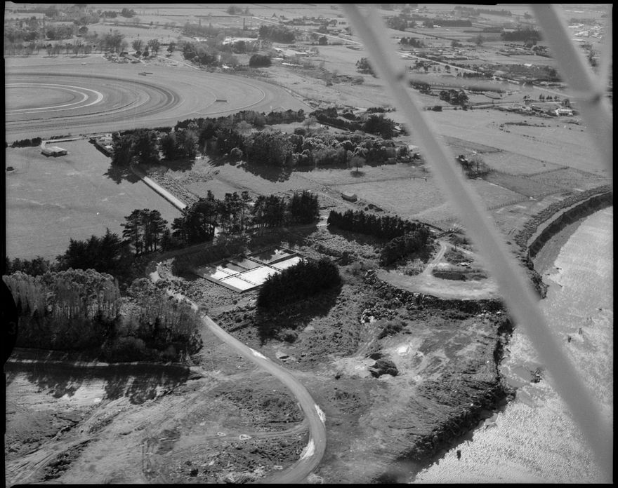 The sewerage treatment plant beside the Manawatu River opened in 1968, replacing the septic tank and filter beds which had been in use since 1905. Some images from this collection have been digitised from prints housed in other archival collections. This image is from an original negative.