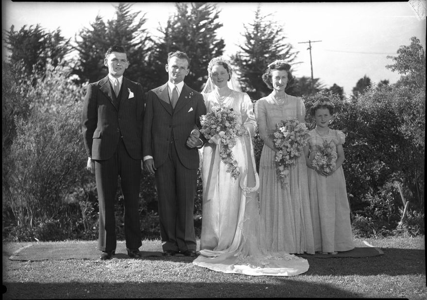 Mrs and Mrs Watts pose at their Marton wedding, accompanied by the best man, bridesmaid and a flower girl.