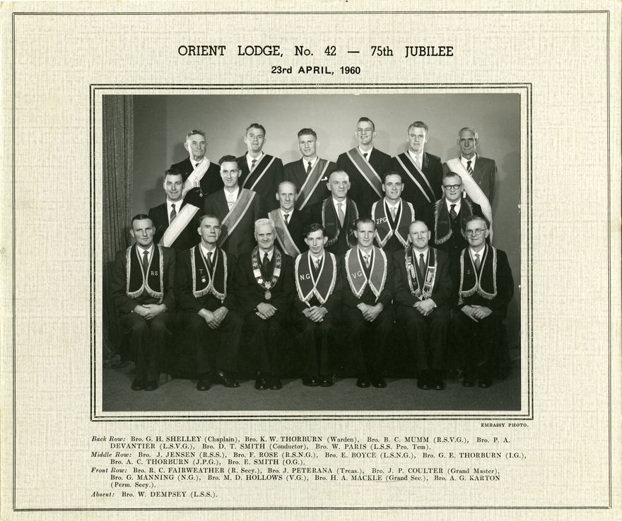 The Orient Lodge of the International Order of Odd Fellows has been operating in Palmerston North since circa 1885. The lodge was located at 412-414 Church Street until the late 1990s. It is likely that the embroidery and regalia was made by Robêrt Embroideries.