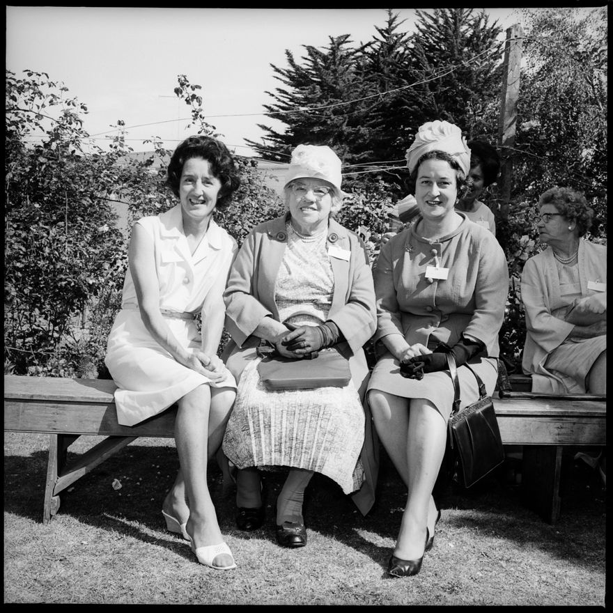 This image was not published in The Manawatu Evening Standard, taken on 20 January, 1964. [Three women sit on a bench at the David Rowland family centenary event in Longburn.]