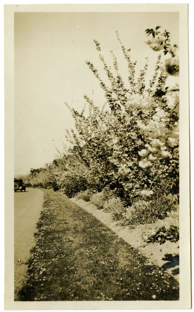 This small photograph album belonged to Mrs R Andrews of Rangitikei House. This photograph has no caption. In the photograph, a car drives down a lane lined with flowering trees that could be in the Victoria Esplanade.