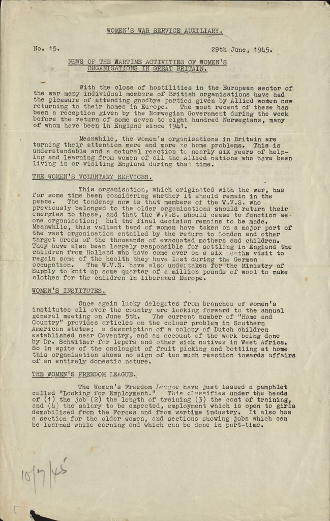 No. 15 News of the wartime activities of women's organisations in Great Britain. Dated 29 June 1945.