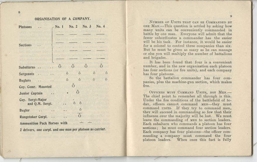 Special District Order No. 43/1915. By Colonel R. W. Tate, Commanding Wellington Military District. The subject of this paper is the four-company organization recently adopted for the infantry of the Regular Army, and which will shortly be also adopted for the Territorial Force. Originally this article was given as a lecture to the London Units of the Territorial Force, by Brevet-Major Hereward Wake, King's Royal Rifles.