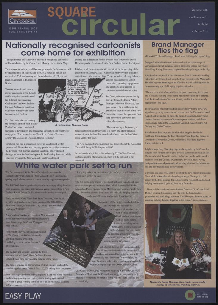 The Square Circular was Palmerston North City Council's monthly community publication, informing Palmerstonians of PNCC initiatives, activites, and events. This month's issue includes: Sam Lamb; branding; cartoonists; art gallery; white water park; Mangahoa river; cycle path; Fitzherbert Avenue; Lido; Queen Elizabeth College mentoring scheme; swimming pool inspections; parking; Festival of cultures; draft annual plan; natural and heritage incentive fund; Arena 4; jazz and blues festival; walking school bus; Guy Donaldson; Regent theatre; rugby museum.