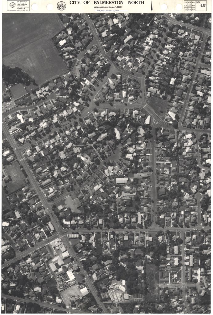 Key to 1986 aerial map survey of Palmerston North. Areas are laid out in grid format and have corresponding alphabetical and numerical number attached according to flight path. Names of streets are included on map. Scale of map is 1:12,500. Individual aerial maps scale are 1:1,000. Compiled by City Planning Department of Palmerston North Corporation..