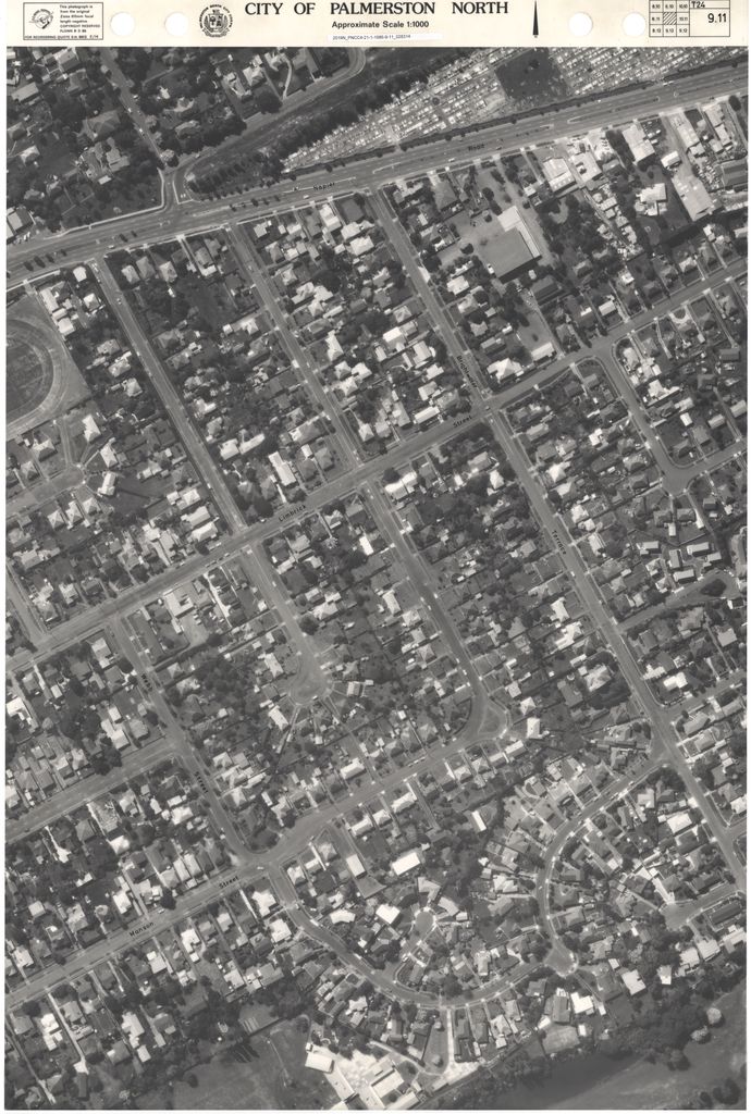 Key to 1986 aerial map survey of Palmerston North. Areas are laid out in grid format and have corresponding alphabetical and numerical number attached according to flight path. Names of streets are included on map. Scale of map is 1:12,500. Individual aerial maps scale are 1:1,000. Compiled by City Planning Department of Palmerston North Corporation..