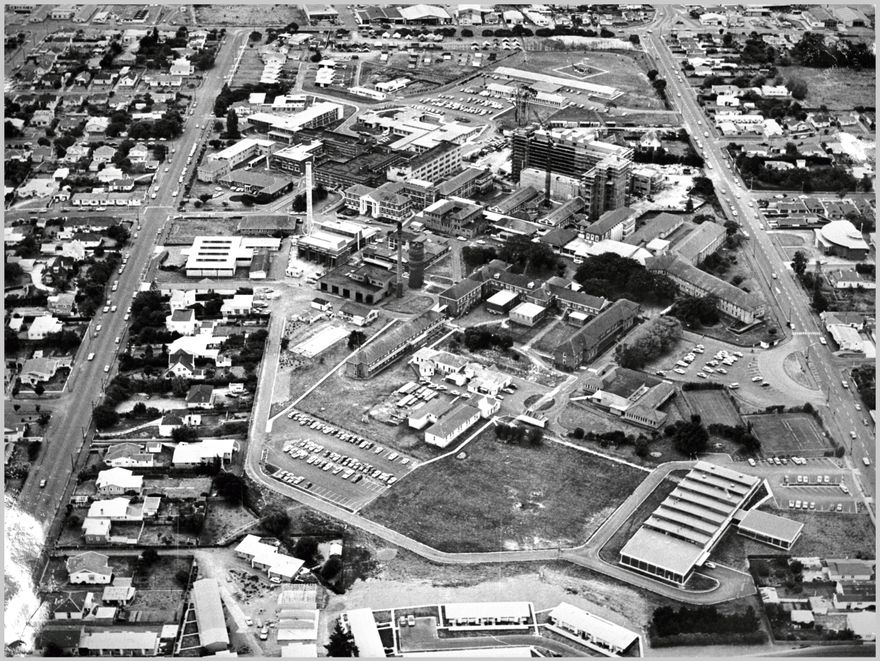 An aerial view of Palmerston North Hospital undergoing expansion and renovation. During the 1970s there was a major rebuilding programme. The Palmerston North Hospital opened in 1893 on the same site. To the right can be seen Ruahine Street running from top (Tremaine Avenue) to bottom, and Heretaunga Street parallel on the left.