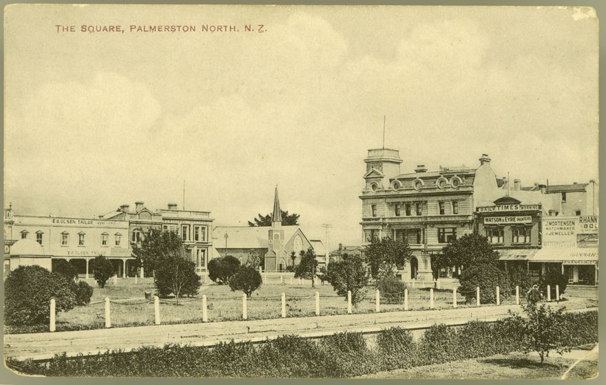 This postcard of the Square shows the South side of The Square, from Church Street West to Main Street West. The buildings, from left, are: E O Olsen Tailors, an unidentified building, the Evening Standard, the Municipal Chambers (now Square Edge), the old All Saints Church, The Grand Hotel (now the Grand Hotel Cafe and Bar), The Daily Times and Watson & Eyre Painters, Watchorn's Jewellers, R Hannah Bootmaker. Train tracks run through the middle of the photograph's foreground.