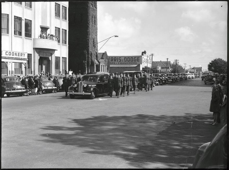 This photograph shows a funeral for the Air Force personnel lost on 25 November 1945 during a routine meteorological flight out of Ohakea. On March 19, 1949 the wreck of the RNZAF Ventura aeroplane with four crew members on-board was discovered; which had been missing since February 28, 1946. The crash location was three miles from Otaki in extremely hill country and the wreck was partially covered by scrub. The crew were: Flight-Lieutenant Walter Gordon Jacobs, the 27 year old Pilot; Flight-Lieutenant Sidney Howard Langton, the 24 year old navigator; Warrant-Officer Hedley Beaumont Newell, the 25 year old wireless-operator-air gunner; AC1 Anthony John Hayhurst, the 22 year old meteorologist. The men were given a combined military funeral at All Saints Church and buried at Kelvin Grove Cemetery in the Military Section. See A175/5 for further information.