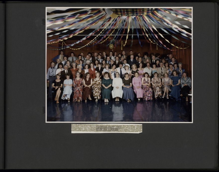 A photograph album from Alexander Clark LTD, a Palmerston North-based home and commercial decoration business. Images include shop displays, staff at work and at social events, and work projects.