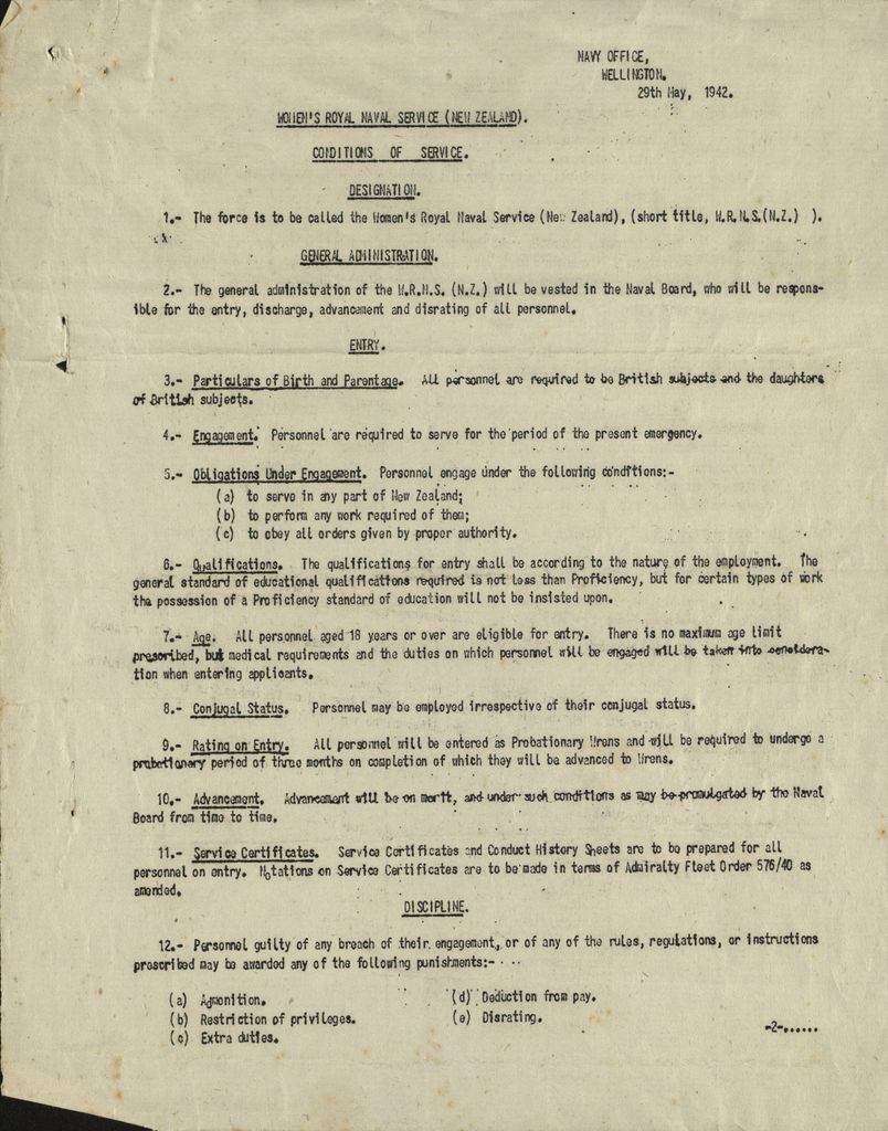 Memo dated 29 May 1942 outlining the conditions of serivce for the Women’s Royal Naval Service (New Zealand).