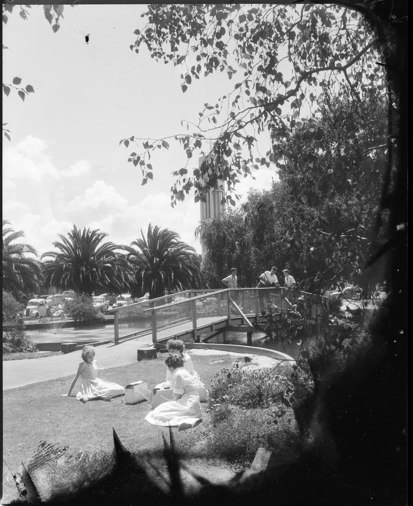 This image was taken for a story that ran in The Manawatu Evening Standard on 13 February 1961: "Visitors to the city yesterday are here seen relaxing in the Square gardens and taking full advantage of the bright sunshine."