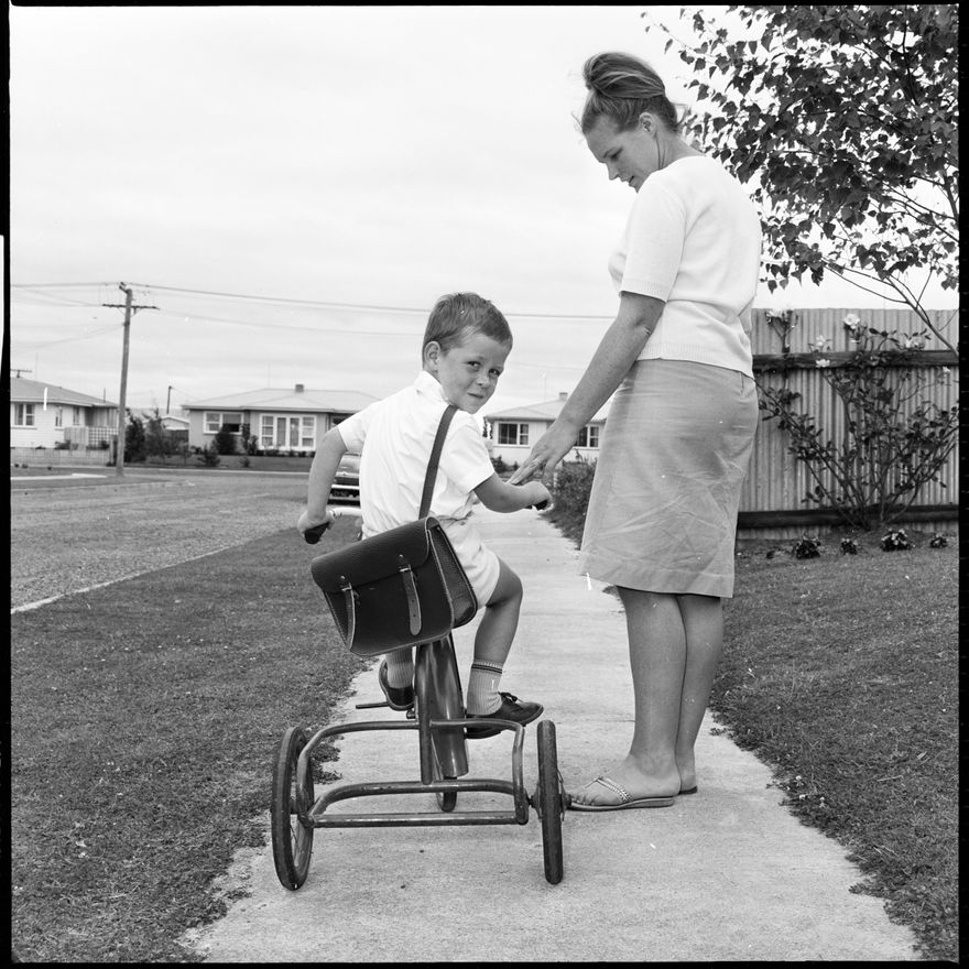 This image was taken (but not used) for a story that ran in The Manawatu Evening Standard on 19th January 1966 "Christopher Plumtree, all dressed up as for the day when he goes to Terrace End School. He is having a practice ride on his tricycle under the eye of his mother, Mrs. C.F. Plumtree, of 3 Conway Place."
