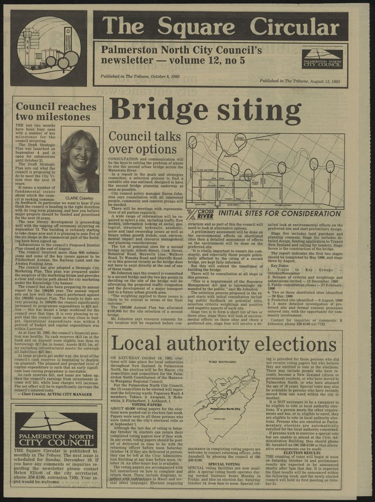 The Square Circular was Palmerston North City Council's monthly community publication, informing Palmerstonians of PNCC initiatives, activites, and events. This month's issue includes: Draft strategic plan; district plan; strategic city marketing plan; second bridge; elections; state of the environment report; rates; Rangitikei Line; recycling; waste management; civil defence; animal control; Esplanade Carnival day; art gallery; Regent theatre; science centre and Manawatu museum; library; ethnic council; community profile pamphlet; meetings.