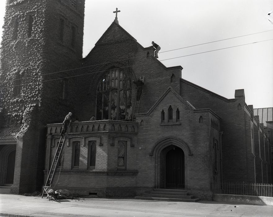 This photograph ran in the Manawatu Evening Standard on 12 September 1959 with the caption: "Creeper around the windows of All Saints Church was removed today to allow more light into the church. A working bee of boys is seen clearing the creeper from the windows."