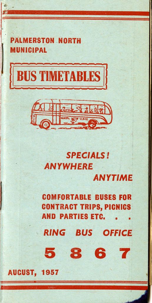 - This booklet from August 1957 provides the timetable for the Palmerston North municipal bus service and opening hours for the library and swimming pool. It also includes timetables for regional bus services run by Newmans Coach Lines, Watts Motors Ltd and Rutherford Bus Company. - The booklet features advertisements for several local businesses, including: Bell's Photo Services; A. E. Williams, Saddlery & Leather Goods; G. A. James, tailor; Arthur Thomas Ltd, Scott's Pharmacy; Erland Wright Floral Studio; Child Bros. Ltd; Eddie Hunt, hairdresser; Fraser Munro Ltd, drapers; The Central Book Club; Boniface Bros. Ltd, bakery; Public Trust Office; Sommerville's Super-service Store; Standen's Home Furnishing; Tisdalls, sports store; W. J. Crawford & Co., printers; Takaro Fruit Supply; J. B. Gerrand and Sons Ltd, watchmakers and jewellers; and Paddy Bros., butchers.