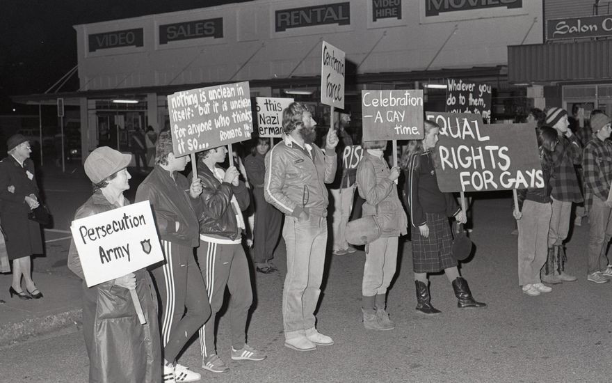 “Feilding Gay Task Force members flank the Salvation Army Centennial march through the town last night. About 15 to 20 task force members walked silently beside the march, letting their banners speak for them in their protest against the Salvation Army’s opposition to the Homosexual Law Reform Bill. Spokesman for the group Peter Pawson said the protesters were asked to stop, but the protest remained peaceful and non-violent.”