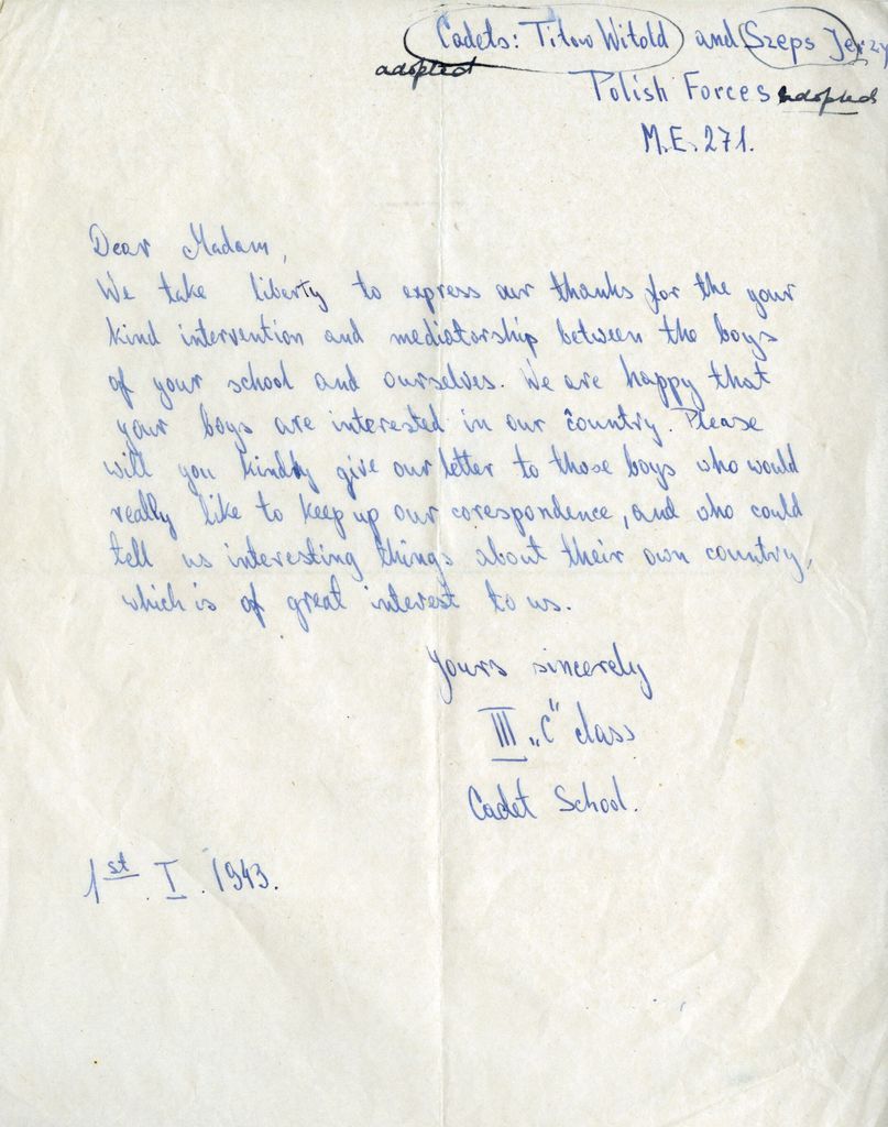 Letter from the Cadet School of the Polish Forces to the Polish Army League, talking about correspondence between New Zealand school boys and the cadets. The Polish Army League, founded in Palmerston North in WWII, corresponded with and sent parcels to Polish soldiers who served with the allies in World War Two.