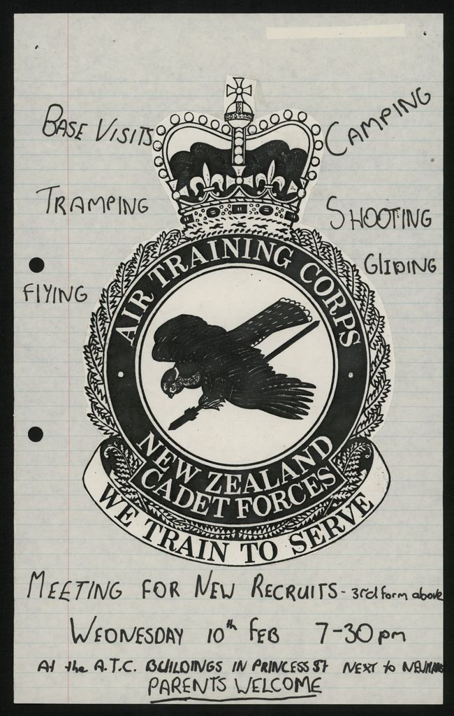 "Air Training Corps. New Zealand Cadet Forces. 'We Train to Serve'. Base Visits. Camping. Tramping, Shooting. Flying. Gliding. Meeting for new recruits - 3rd Form above. Wednesday 10th Feb 7-30pm. At the A.T.C. buildings in Princess St next to Newmans. Parents welcome." Part of a collection of posters that were displayed in the Public Library in the 1970s - 1980s.