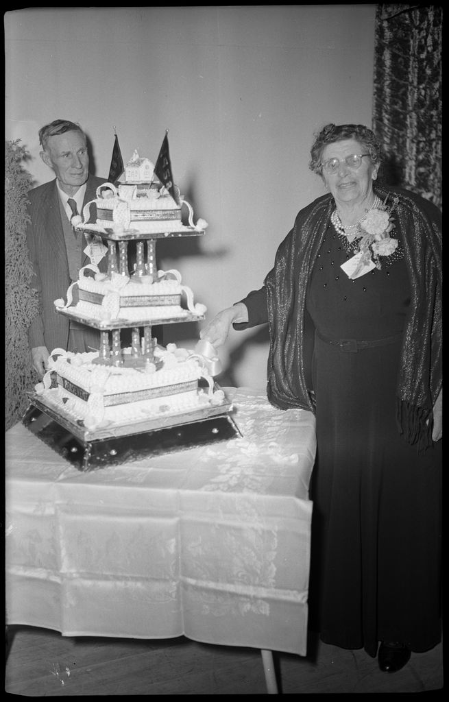 This image was taken for a story that ran in The Manawatu Evening Standard on 18 August 1958, page 8: "Mrs. Howard, formerly Miss Mary Jane Jefferies, a first day pupil of the Bunnythorpe School is seen cutting the jubilee cake during the banquet held at Palmerston North on Saturday night. The cake was decorated by Mrs. S. Wiggins, of Ashhurst, carrying school colours (brown and gold) and the school motto ("Persevere")"