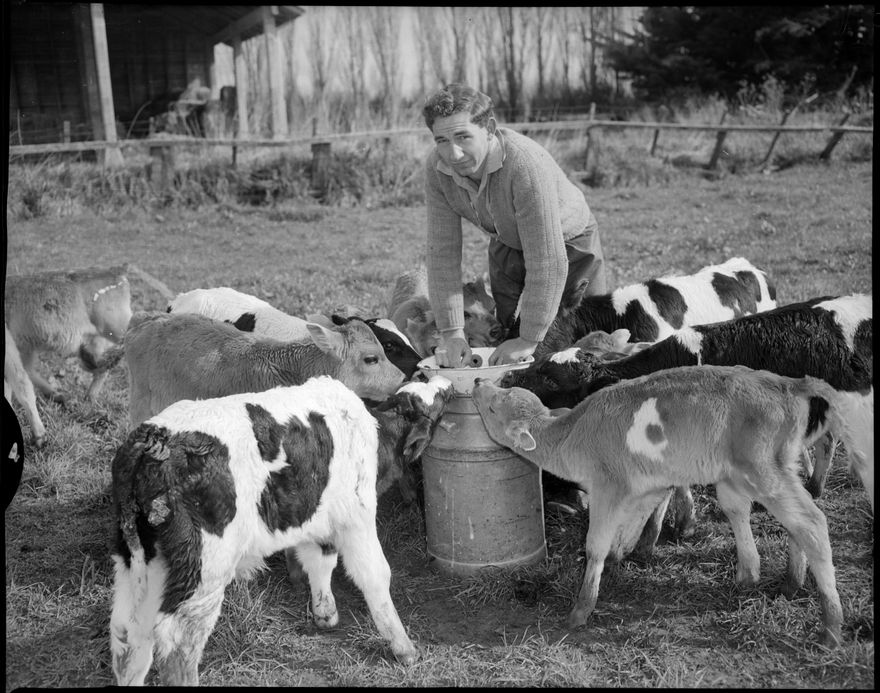 This image was taken for a story that ran in The Manawatu Evening Standard on 29 August 1961 "Taking no interest in the photographer, these calves on the Massey College dairy farm were making every effort to obtain at least one good meal. Mr. L. Bristol is proud of his charges."