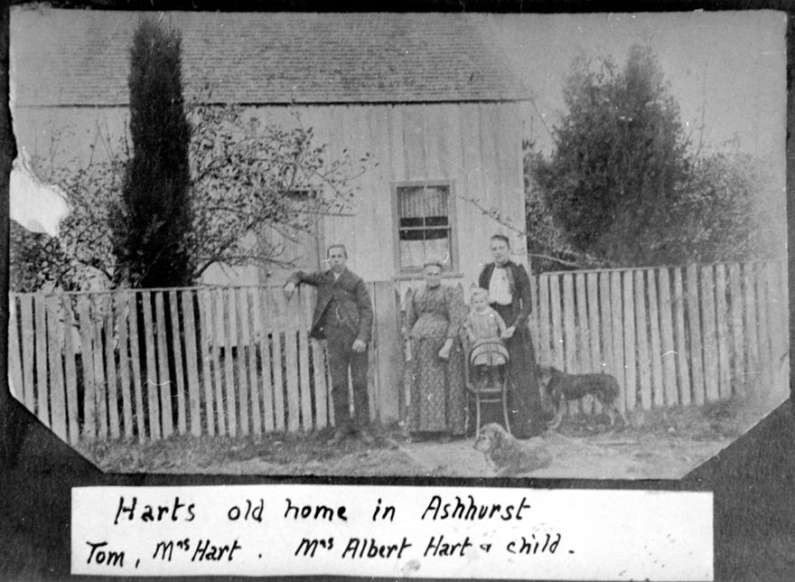The people in this photograph have been identified as, from left: Tom; Mrs Susan Hart; Mrs Louise Hart and child. Richard (c.1837- 1903) and Susan Hart (c.1838-1909) migrated from England to New Zealand with their children on the sailing ship Rakaia in c.1879. The family took up farming activities in Ashhurst. The couple had six sons, Albert, John, William, Robert, George and Tom. In 1897 Albert Hart (c.1865-1940) married Louise Vautier (1872-1945) of Foxton and the couple had eight children. Thomas Hart died on 30 November 1918 during the Influenza epidemic, aged 44 years. This house was located on Harrisons Line.