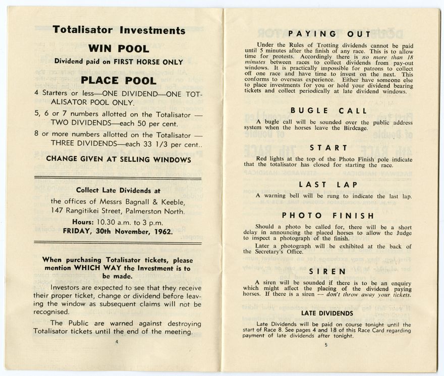 A programme from the Manawatū Trotting Club's inaugural night trotting meeting held at the Manawatū Raceway, 21 November, 1962.