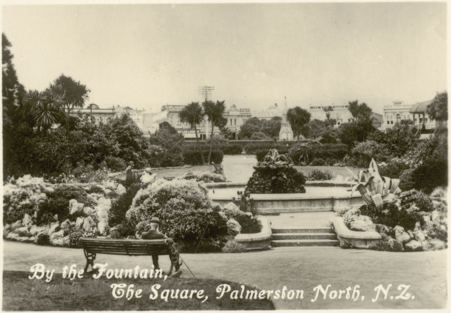 This image is from a series of souvenir cards that show various locations around Palmerston North. This card shows a foutain in The Square, designed and constructed by the Beautifying Society in 1906. The fountain was made of concrete and the central rockery of concrete and stone. In 1926, the Kind Edward Coronation Monument was removed from the centre of The Square and was re-sited in the middle of the fountain. Today the fountain sits in the corner of The Square near Broadway Avenue.
