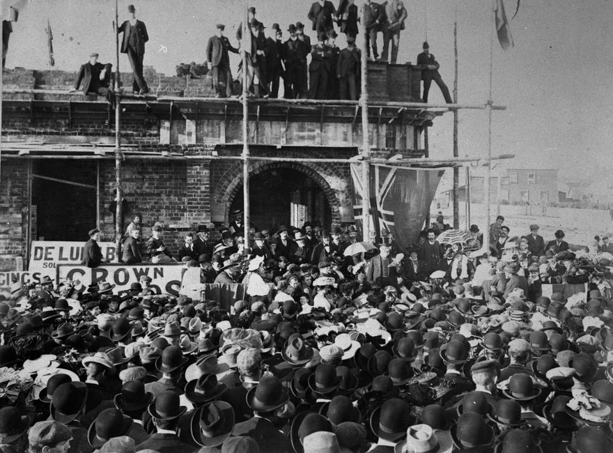 A new two-storey brick Post Office, complete with clock tower, was constructed on the corner of The Square and Main Street east, Palmerston North, in 1905-1906. It remained in use as a Post Office until 1988. It currently houses a bar and cafe called Highflyers (2007). The crowd is listening to Sir Joseph Ward, then Postmaster-General, probably when a plaque, to commemorate commencement of work, was laid.