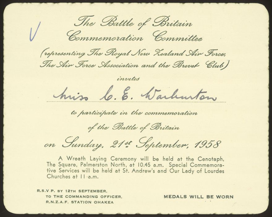 Invitation from the Royal New Zealand Air Force to Charlotte Warburton, to participate in the Battle of Britain commemoration ceremony and service, 21 September 1958, in Palmerston North. Charlotte Warburton (1883-1961) was chairwoman of the Women's War Service Auxiliary in Palmerston North and was very actively involved in the war effort. From the archive of 'C E Warburton'.