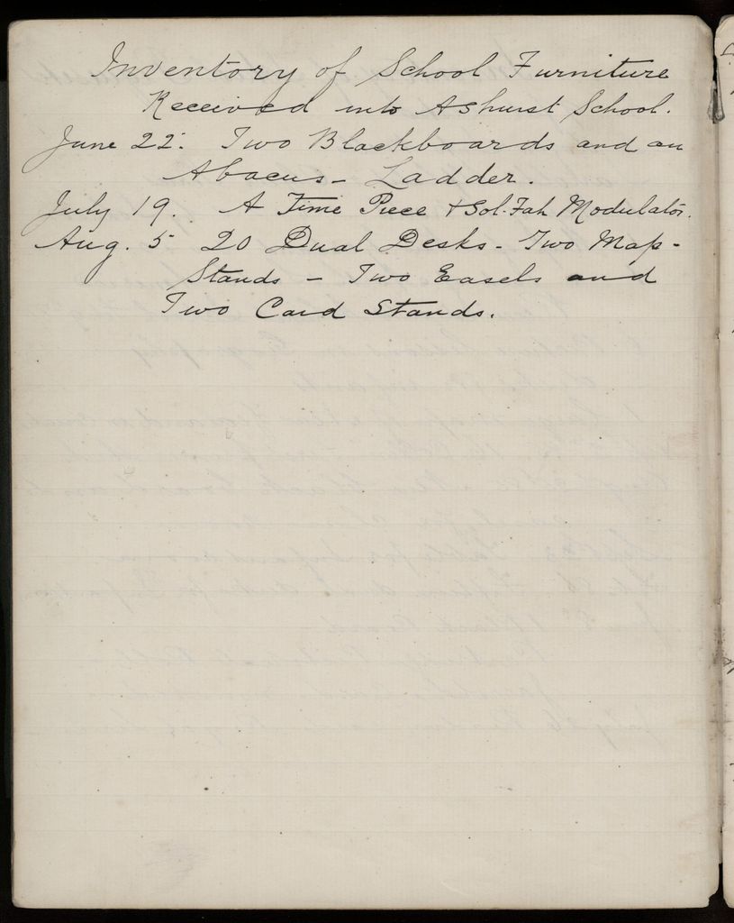 Ashhurst School opened in September 1879, with Mr F. Whibley as the temporary head teacher. The first permanent head teacher was Mr Alfred Gower (c.1880-1887). In addition to documenting the activities of the school, this log book also includes: School Inspectors’ Reports; an inventory of school furniture, 1885; and an inventory of school requisites, undated.