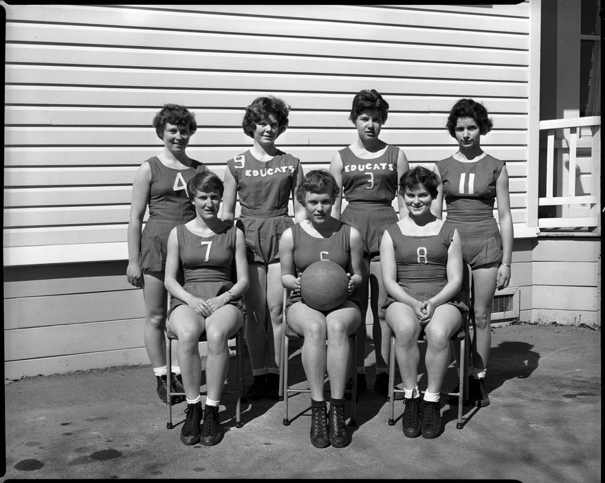 A group of seven female students from the Palmerston North Teachers' College pose with a ball dressed in uniforms emblazoned with the team name "Educats." This negative comes from the Elmar Collection - a large series of semi-identified and unidentified images from the 1930s-1970s.