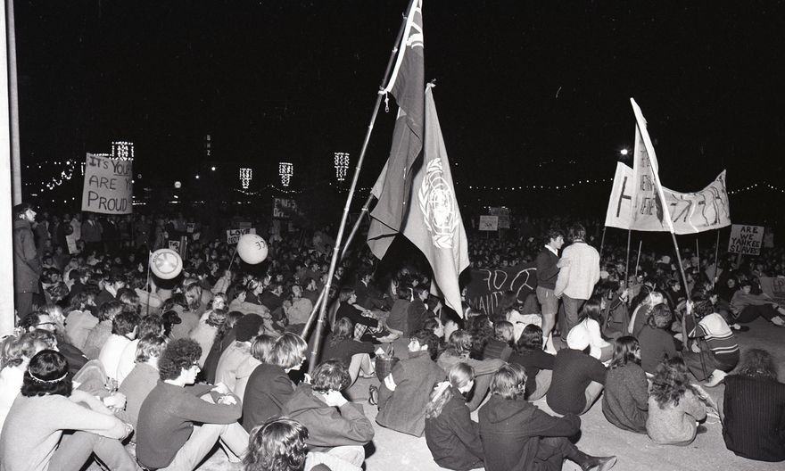 This image was taken (but not used) for a story that ran in The Manawatu Evening Standard on the 1st of May 1970. "Two thousand people sat and stood in front of the Palmerston North Clock Tower last night and sang “We Shall Live in Peace” as the climax to probably the biggest protest march held in Palmerston North.”