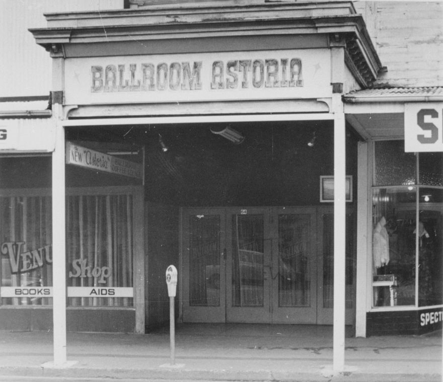 The Astoria Ballroom, was originally built as Her Majesty’s Theatre, and ran as such 1911-1915. It was then used as a skating rink, auction rooms and for storage until returning to theatre use as the Paramount, then the De Luxe (1924-1930). It continued use as the De Luxe Skating rink, the De Luxe Dance Hall, the Coconut Grove Dance Hall (1936-1942), ANA Dance Hall, George Street Dance Hall and eventually the Astoria Ballroom from approximately 1948-1984. The Astoria Ballroom was managed by Astoria Promotions, formed in 1964, who leased the ballroom from Recreation Manawatu Ltd, a subsidiary company of Kerridge Odeon Corp. Ltd. The large hall/ballroom was demolished in 1984 but the facade remains. The building is now used for retail.