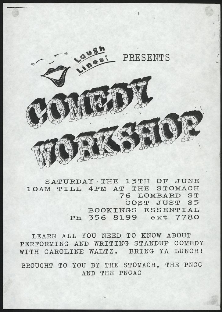 Learn all you need to know about performing and writing standup comedy with Caroline Waltz. bring ya lunch! Brought to you by The Stomach, The PNCC and The PNCAC.