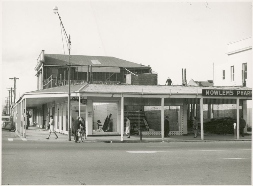 This series of images depicts the development of the site at the corner of The Square and Main Street (east) over the period of 17 June 1963 – 5 April 1965. During this time these existing buildings including the former Municipal Council Offices/Third Public Library the former Manawatū Evening Standard offices, and the corner retail building) were demolished to make way for the construction of a new public library. The public library was officially opened on 4 November 1965. The corner building being demolished formerly housed Evan's Bag Store and Mowlem's Pharmacy.