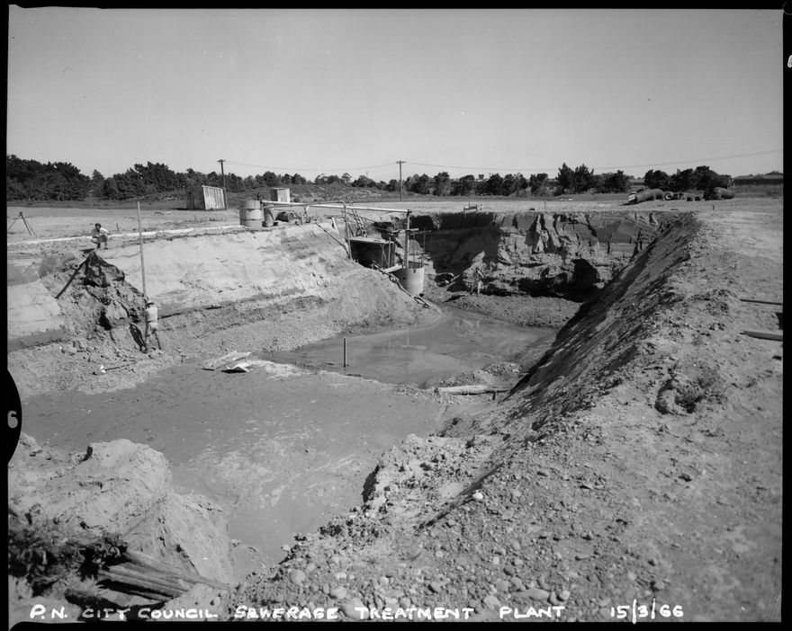 The sewerage treatment plant beside the Manawatu River opened in 1968, replacing the septic tank and filter beds which had been in use since 1905. Some images from this collection have been digitised from prints housed in other archival collections. This image is from an original negative.