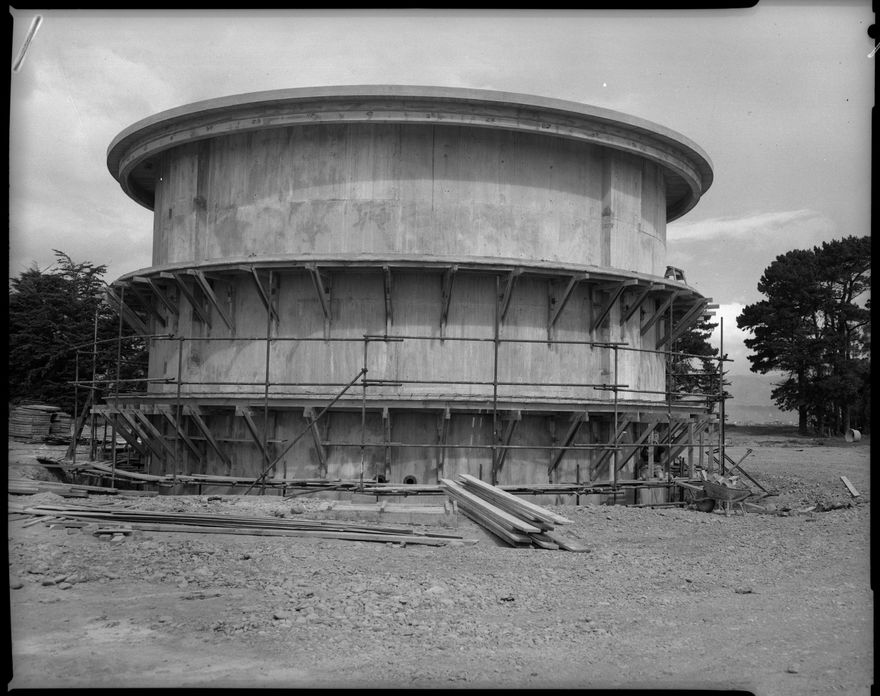 The sewerage treatment plant beside the Manawatu River opened in 1968, replacing the septic tank and filter beds which had been in use since 1905. Some images from this collection have been digitised from prints housed in other archival collections. This image is from an original negative.