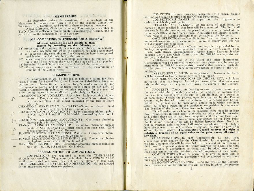 This is the programme for the Sixth Annual Festival of the Manawatū Competitions Society, which was held in the Opera House and Municipal Hall between 6 May and 14 May 1927. The competition categories included elocution (speech and drama), dance and music (both vocal and instrumental). Most entrants were children or young people. In addition to listing the events and names of competitors, the programme features many advertisements for local businesses. This copy belonged to W. Newlands, secretary and treasurer of the society, and includes additional pages and handwritten notes.
